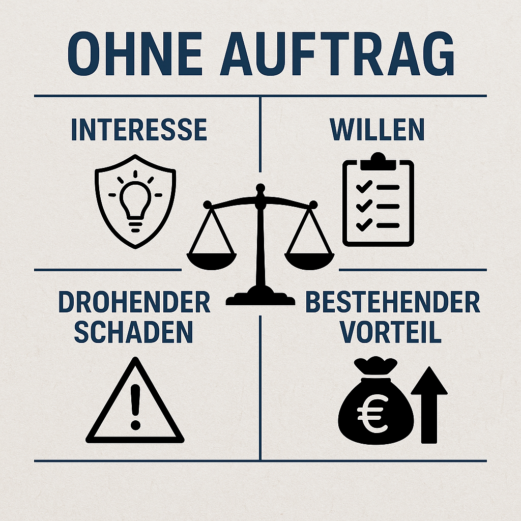 Die Geschäftsführung ohne Auftrag setzt voraus, dass das übernommene Handeln sowohl im Vorteil des Geschäftsherrn liegt als auch dessen Willen entspricht. Diese Voraussetzungen sind entscheidend, um die Legitimität und Angemessenheit der Maßnahme rechtlich einzuordnen. Unter dem Aspekt des Interesses ist zu verstehen, dass die Handlung objektiv nützlich sein muss. Ob der Geschäftsherr das konkrete Verhalten bereits in Betracht gezogen oder ausdrücklich verlangt hat, spielt dabei keine Rolle. Maßgeblich ist eine objektive Einschätzung der Situation: Wenn durch das Eingreifen ein drohender Schaden verhindert oder ein bestehender Nutzen gesichert wird, ist von einem solchen Interesse auszugehen.